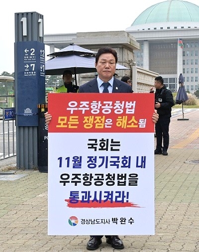 박 도지사는 국회 정문 앞에서 '우주항공청법 모든 쟁점은 해소됨, 국회는 11월 정기국회 내 우주항공청법을 통과시켜라'는 문구가 적힌 피켓을 들고 1인 시위를 진행했다.