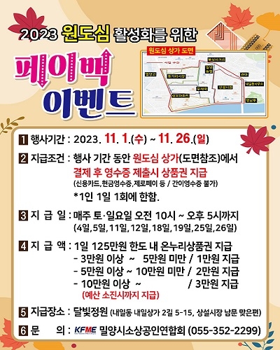 경남 밀양시는 침체된 원도심의 경제회복을 유도하고 지역 내 소비 촉진을 위해 페이백 이벤트를 실시한다고 1일 밝혔다.
