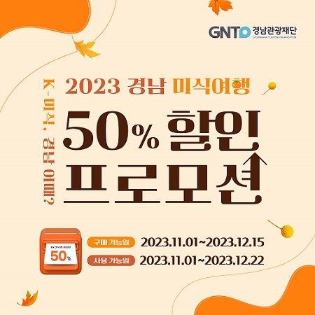 경남도와 경남관광재단은 2023년 경남 미식여행 예약결제시스템의 할인이벤트를 11월 1일부터 12월 15일까지 45일간 진행한다고 밝혔다.