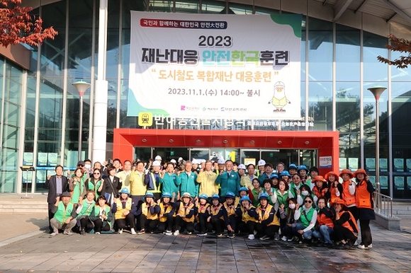 1일 부산도시철도 4호선 반여농산물시장역 일대에서 ‘2023년 재난 대응 안전한국훈련’을 실시하고 기념촬영을 하고 있다.(사진=해운대구 제공)