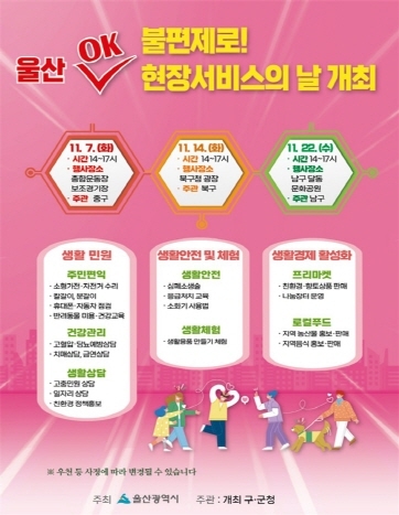 '불편제로! 울산 오케이(OK)현장서비스의 날’은 올해의 경우 3개 구(중구‧남구‧북구)에서 시범 운영되고, 내년에는 5개 구‧군(구‧군별 2회, 총10회)으로 전면 확대될 예정이다.