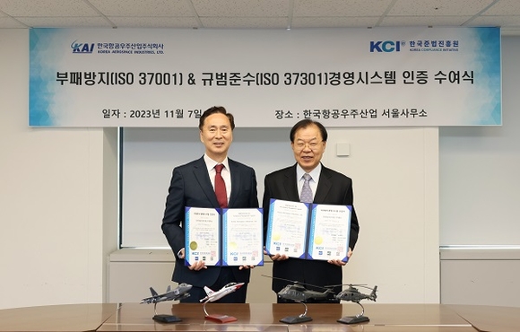 한국항공우주산업(KAI)이 7일 한국준법진흥원(KCI)으로부터 규범준수 경영시스템(ISO 37301) 및 부패방지 경영시스템(ISO 37001) 국제표준 통합인증을 획득했다고 밝혔다.