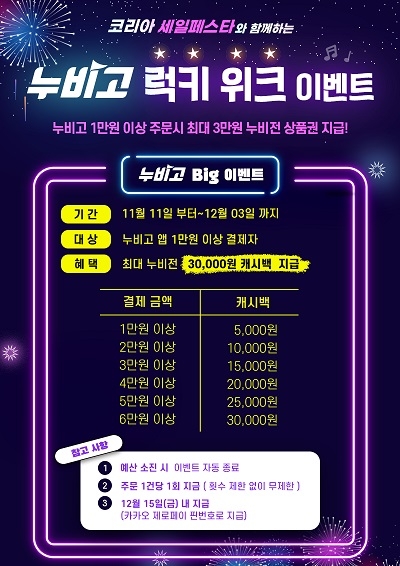 이번 이벤트는 오는 11일부터 12월 3일까지 3주간 배달앱 누비고에서 1만 원 이상 결제 시 최대 모바일 누비전 3만 원을 캐시백으로 제공하는 행사다.
