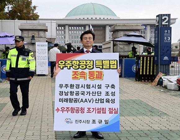조규일 진주시장이 9일 국회 앞에서 '우주항공청 설치 및 운영에 관한 특별법'의 조속한 통과를 위한 1인 시위를 벌였다.