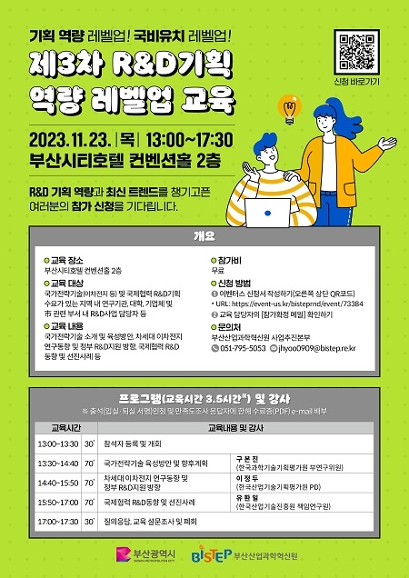 부산산업과학혁신원(BISTEP)이 지역 연구자 및 R&D사업 담당자의 기획 실무 역량 제고를 위해 오는 23일 부산시티호텔에서 ‘제3차 R&D기획 역량 레벨업 교육’을 실시한다고 밝혔다.