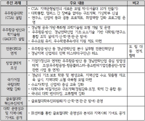 경상국립대는 학교 간, 캠퍼스 간, 단과대학 간 장벽을 없애는 과감한 구조개혁을 진행할 계획이다. 또한 공유개방형 대학 모델인 '우주항공대학(CSA)'을 설립하고, 우주항공대학 우수학생에게는 등록금과 생활관비를 전액 면제한다. 다양한 융합전공을 개설하고 우수 교원을 초빙해 우주항공 분야 인재를 양성할 계획이다.