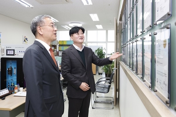 김종호 기술보증기금 이사장이 14일 경기도 의왕시 소재 엠에스텍을 방문해 규제 관련 애로사항을 청취하고 이노비즈협회 정책연구원장과 함께 혁신기술기업의 기술개발·투자 촉진을 위한 규제 개선방안 등을 논의했다.