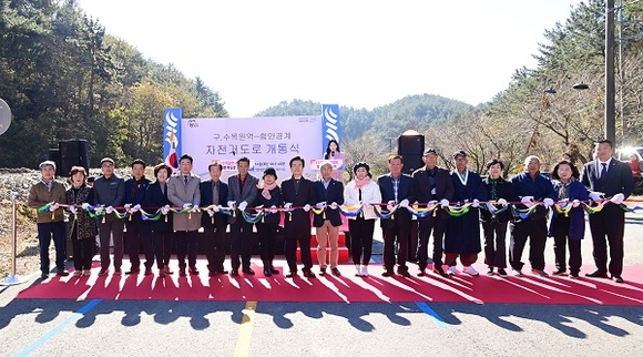 경남 진주시는 14일 오전 이반성면 평촌리 소재 어석터널 인근(함안경계)에서 '옛 수목원역~함안경계 자전거도로 개설공사' 개통식을 가졌다.