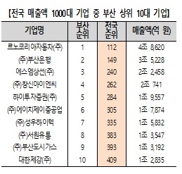 매출 순위 면에서 지난해 전국 매출 1000대 기업에 속한 부산 기업 28개사 중 절반 이상인 15개사가 500위권 밖인 것으로 조사됐다. 부동의 지역 매출 1위 기업인 르노코리아자동차는 사명변경과 브랜드 리뉴얼, 수출실적 증가 등으로 매출과 영업이익이 늘어나면서 전국순위를 8단계 끌어 올렸지만 전국순위는 112위로 매출 100위권 재진입에는 실패했다. 르노코리아자동차는 2019년 94위를 기록한 것을 마지막으로 전국 100위권 안에 들지 못하고 있다.