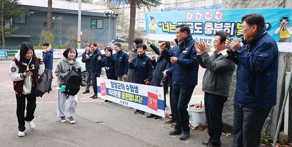 이날 고사장 앞에는 수능생들을 응원하기 위해 함양교육지원청 교육장과 직원들, 군청 국장 및 실과장들도 함께했다.