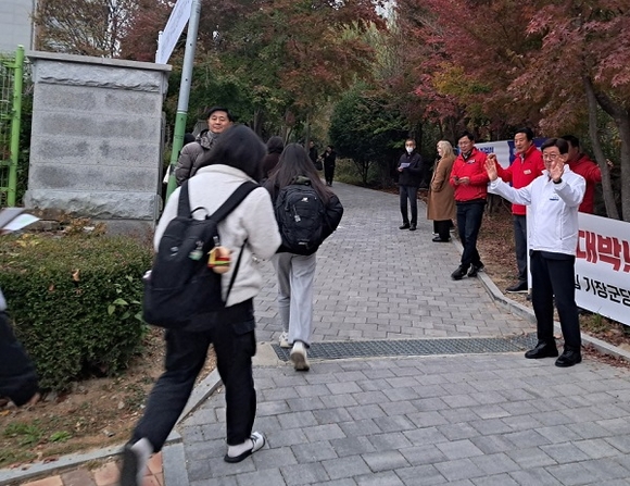 16일 정종복 군수가 관내 시험장으로 들어가는 수험생들을 격려하고 있다.(사진=기장군 제공)