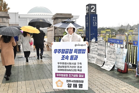 양해영 진주시의회 의장이 16일 국회에서 우주항공청 설치 및 운영에 관한 특별법의 조속한 통과를 촉구하는 1인 시위 캠페인에 동참했다.