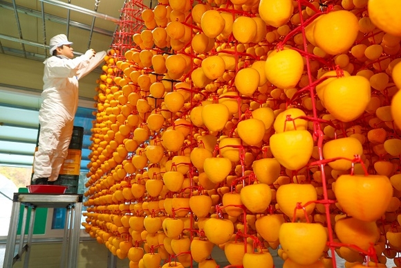 17일 경남 산청군 시천면 이인호 곶감농가(해운농장)에서 아들 철민씨가 고종시(떫은감)를 말리고 있다. 건조장에 널린 고종시는 청정지역 지리산 자락에서 40~50일간 바람을 맞으며 부드럽고 쫄깃한 산청 명품곶감으로 탈바꿈한다. (사진=산청군 제공)