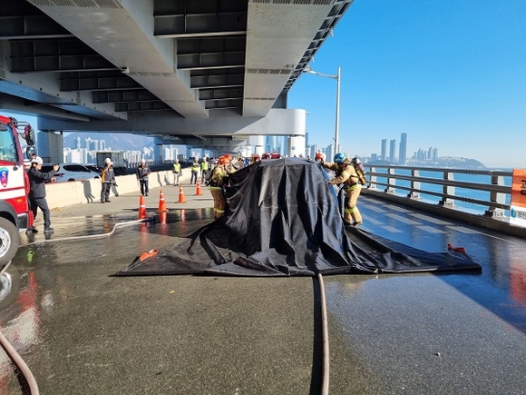 광안대교에서 발생하는 전기차 화재에 대응하고자 부산시설공단, 부산남부소방서, 부산남부경찰서가 손을 잡아 합동으로 훈련을 진행했다.