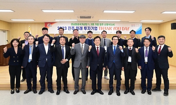 경남 진주시는 20일 충무공동 경남진주혁신도시 복합혁신센터에서 한국토지주택공사(LH)와 함께 '2023 진주 미래 투자기업 THANK YOU DAY' 행사를 열어 지역 경제 활성화와 일자리 창출에 기여한 17개 투자 기업인들을 격려하고 감사의 마음을 전달하는 자리를 가졌다.