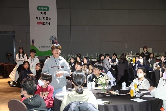 토론회는 '우리가 꿈꾸는 행복한 학교'를 주제로 초·중·고등학교 학생 75명, 교원 75명 등 150여 명이 참여해 소그룹 18개로 나눠 진행했다.