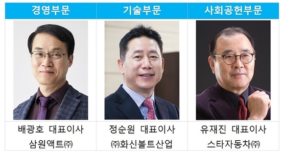 부문별 수상자로는 ▲경영부문 삼원액트㈜ 배광호 대표이사 ▲기술부문 ㈜화신볼트산업 정순원 대표이사 ▲사회공헌부문 스타자동차㈜ 유재진 대표이사가 각각 선정됐다.
