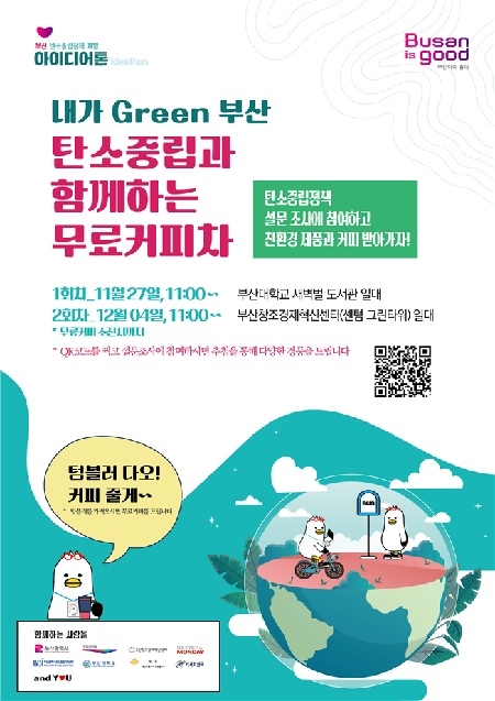 부산시가 오는 27일 부산대학교에서, 12월 4일 센텀시티 빌딩가에서 '내가 Green 부산, 탄소중립과 함께하는 무료커피차'를 운영한다고 밝혔다. 행사일 오전 11시부터 무료커피 소진 시까지 운영된다.