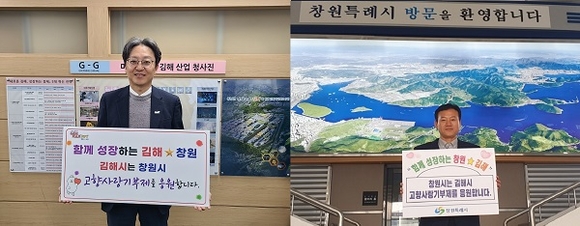 김해시 박종환 혁신경제국장과 창원시 류효종 기획조정실장은 지난 23일 각각 이웃 도시 고향사랑기부제를 응원하는 피켓을 들고 합동 홍보의 시작을 알렸다.