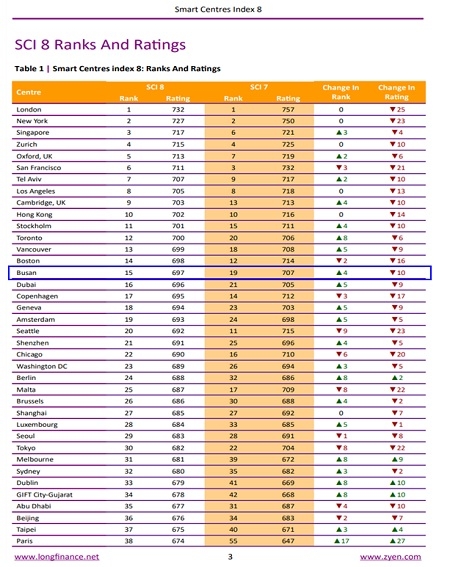 부산시는 세계 지능형센터지수(글로벌 스마트센터지수, SCI) 8회차 평가에서 전 세계 주요 도시 77곳 가운데 15위에 올랐다고 밝혔다.