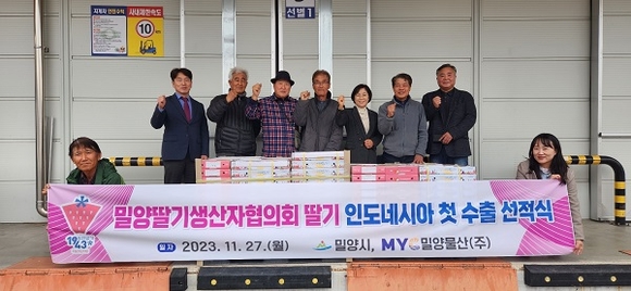 경남 밀양시는 27일 농업기술센터에서 밀양딸기생산자협의회협동조합의 인도네시아 첫 수출 선적식을 가졌다.