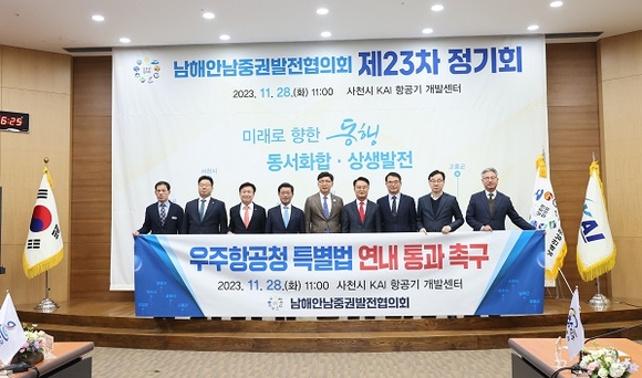 남해안남중권발전협의회가 28일 경남 사천시 KAI 항공기 개발센터에서 남해안남중권의 미래비전을 모색하기 위한 '제23차 정기회'를 가졌다.