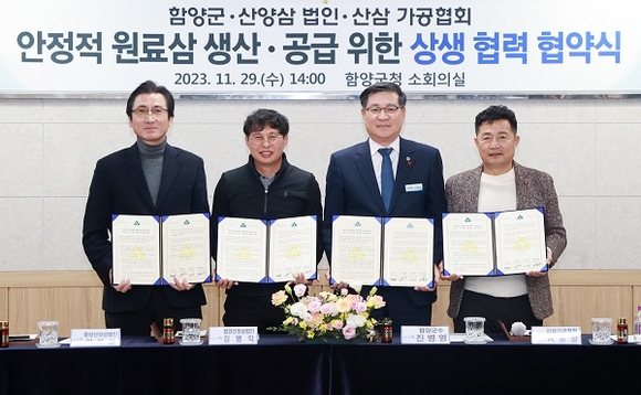 경남 함양군은 지난 29일 군청 소회의실에서 지역 내 산양삼 생산 법인 및 가공협회와 '함양 산양삼 산업화와 안정적 원료삼 생산·공급을 위한 상생 협력 협약'을 체결했다.