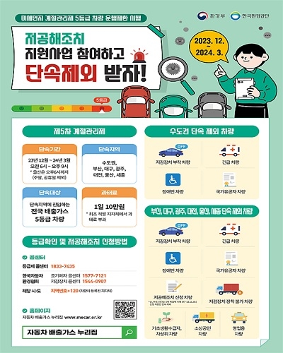 울산지역까지 확대 시행되는 5등급 차량 운행제한의 참여율 제고를 위해 TV·라디오 캠페인 홍보도 집중적으로 추진하고 정책 수용자를 고려한 맞춤형 현장 교육·홍보를 전개하는 한편, 인스타그램, 블로그 등 SNS와 전광판, 현수막 등을 활용한 온·오프라인 홍보를 강화할 계획이다.