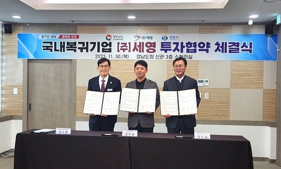 경남도는 30일 도청 소회의실에서 창원시와 공동으로 러시아 최초 국내복귀기업인 ㈜세영과 50억 원 규모의 투자협약을 체결했다.