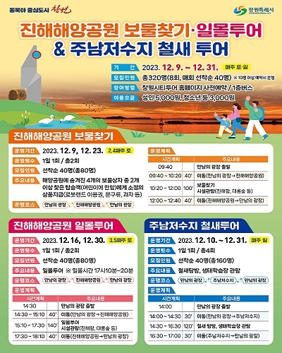 이날 오후 14시 만남의 광장에서 시티투어버스 탑승, 주남저수지에서 내려 2시간 동안 자유롭게 탐방을 즐긴 뒤 다시 버스를 타고 만남의 광장으로 돌아온다.