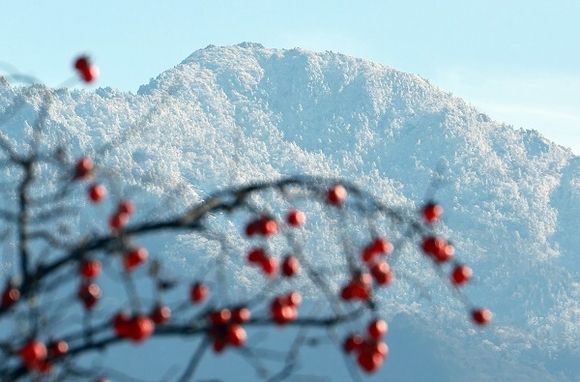 3일 경남 함양군 마천면 촉동마을에서 바라 본 지리산 천왕봉이 하얀 눈으로 쌓여 있다. (사진=함양군 제공)