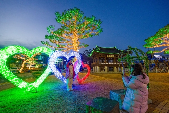 7일 경남 산청군 산청읍 한마음공원 삼청루의 조명 경관이 형형색색의 빛으로 연말 분위기를 물씬 풍기고 있다. 삼청루는 산청이 예로부터 산과 물, 사람이 맑다고 해 삼청(三淸)의 고을이라 불린 의미를 담고 있다. (사진=산청군 제공)
