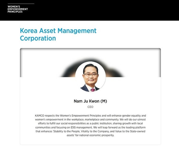 권남주 캠코 사장은 “금번 WEPs 가입을 계기로 양성평등에 앞장서고 공정한 조직문화를 구현해 ESG경영 선도기관으로 확고히 자리매김할 것”이라며 “앞으로도 ESG경영 실천을 강화해 새로운 미래 전환을 선도해 나가겠다”고 전했다.
