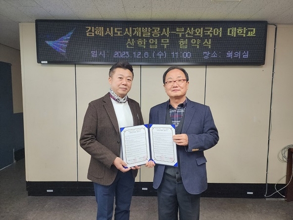 김해시도시개발공사와 부산외국어대학교는 지난 6일 공사 회의실에서 업무협약을 체결, 긴밀한 산학협력 체계를 구축하기로 했다.
