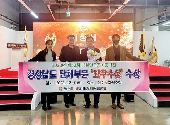 경남도는 7일 오후 충북 청주시 문화제조창에서 열린 '제53회 대한민국 공예품대전' 시상식에서 시도 단체상 부문 최우수상(대통령기 및 문화재청장상)을 수상했다고 밝혔다.