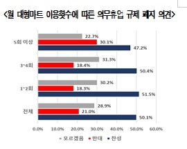 월 대형마트 이용횟수에 따른 의무휴업 규제 폐지에 대한 응답을 보면 월 5회 이상 고객(47.2%)보다 월 1~2회(51.5%), 3~4회(50.4%) 이용고객의 찬성 비중이 더 높은 것으로 나타났다. 이는 시간적 여유가 많거나 대형마트를 자주 방문하는 고객보다는 맞벌이 부부, 주말부부 등 계획구매를 위해 대형마트를 이용하는 고객이 의무휴업으로 인한 불편이 더 큰 것으로 보인다.