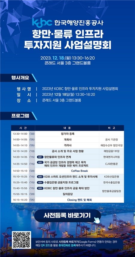 한국해양진흥공사가 오는 18일 콘래드 서울 그랜드볼룸에서 ‘2023년 KOBC 항만·물류 인프라 투자지원 사업설명회’를 개최한다고 밝혔다.