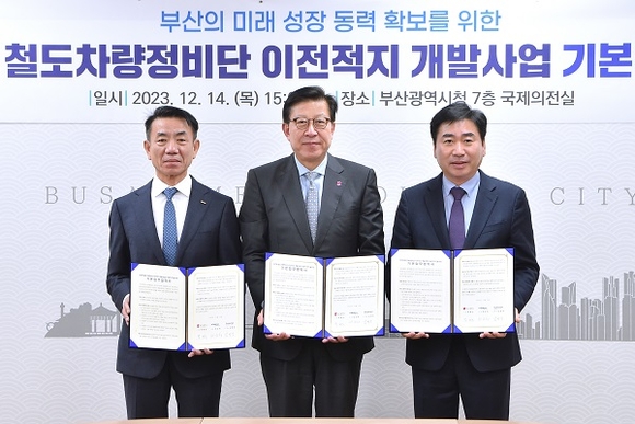 부산시는 14일 오후 한국철도공사, 부산진구와 ‘범천동 철도차량정비단 이전적지 개발사업 업무협약’을 체결했다고 밝혔다.