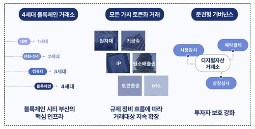 부산 디지털자산거래소는 부산이 보유한 물류․문화․금융 기반을 활용해 다양한 가치의 자산을 블록체인 기술을 통해 디지털화하고 이를 거래할 수 있도록 하는 플랫폼이다. 민간의 자율과 창의성을 극대화하기 위해 100% 민간법인으로 설립된다.