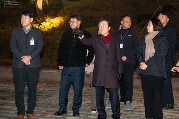 조규일 진주시장은 지난 13일 진주성 촉석문 아래 옹벽 정비 후 설치된 경관조명 준공에 앞서 공무원 등 관계자 10여 명과 함께 현장을 찾아 최종 점검했다.