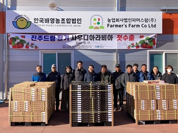 경남 진주시는 지난 17일 농업회사법인 파머스팜(주)에서 사우디아라비아로 진주드림(진주시농산물 공동브랜드) 딸기 640kg을 첫 수출했다고 밝혔다.