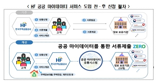 기존에는 주택금융 서비스를 신청하는 고객은 주민등록표 등·초본, 건강보험자격득실확인서, 소득금액증명원 등의 각종 서류를 개별기관 등에서 발급받아 HF공사에 제출해야 했으나 이 서비스 도입으로 고객이 HF공사 홈페이지 또는 스마트주택금융 앱에서 보금자리론 신청 등 18개 업무 처리 시 ‘본인정보 제3자 제공요구’ 한 번으로 필요서류들을 제출할 수 있게 됐다.