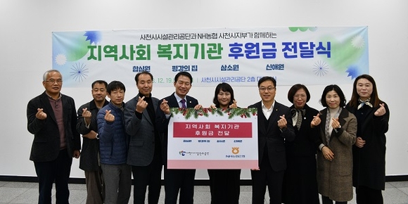이날 후원금은 농협은행 사천시지부에서 협찬한 총 500만원으로 지역사회 공헌을 위해 관내 복지시설인 합심원, 삼소원, 평강의 집, 신애원 등 4개소의 복지시설의 운영지원을 위해 소중하게 활용될 예정이다.