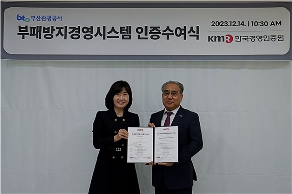 부산관광공사가 지난 14일 한국경영인증원(KMR)으로부터 부패방지경영시스템(ISO 37001) 인증을 취득했다고 밝혔다.