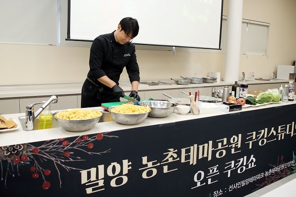 이날 쿠킹쇼는 국내 최정상급 셰프인 최현석 셰프를 초빙해 관람객과 소통하며 밀양고유의 지역특산물인 사과, 포도를 활용한 돼지고기 샐러드, 깻잎, 청량고추를 활용한 깻잎파스타 음식을 시연하는 쿠킹쇼를 개최해 관람객에게 쿠킹스튜디오를 비롯한 농촌테마공원의 시설을 알리는 시간이 됐다.