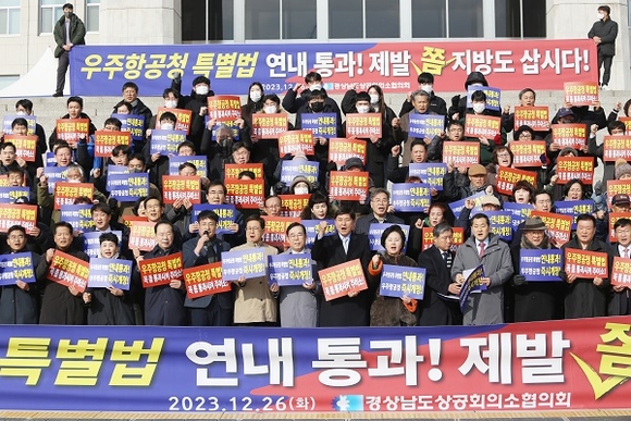 경남상의협의회 회장단은 여·야 국회의원에게 전달한 건의문에서 “국가 미래성장의 새로운 동력이 될 우주항공청 설립이 정쟁과 타협의 대상이 된 것에 대한 안타까운 심정으로 국회를 찾았다. 수개월째 국회에서 논의만 이어지고 있는 지금, 지역민들의 기대감은 불안감으로 변했다”며 “경남은 KTX, SRT 등 제대로된 철도인프라조차 갖추어져 있지 않았으며, 국내 최저의 의과대학 정원을 가진 지역이며, 단 하나의 로스쿨, 한의대도 갖추지 못하는 등 상대적 박탈감을 가지며 살아왔다.”고 말했다.
