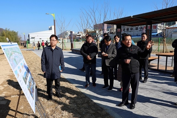 나동연 양산시장이 26일 '웅상 회야강 르네상스' 비전에 포함된 회야강의 특색있는 산책로 조성 3단계 사업 중 최근 준공한 '회야강 산책로(백동교~주남교) 정비공사' 현장을 점검하고 향후 차질 없는 사업 추진을 당부했다.