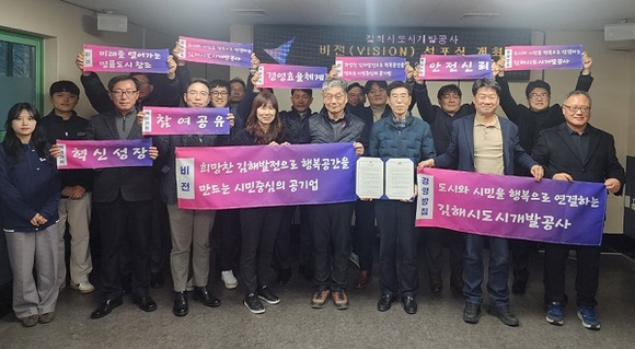 김해시도시개발공사는 지난 26일 공사 회의실에서 임직원 20여 명이 참석한 가운데 '2023 김해시도시개발공사 비전 선포식'을 가졌다.