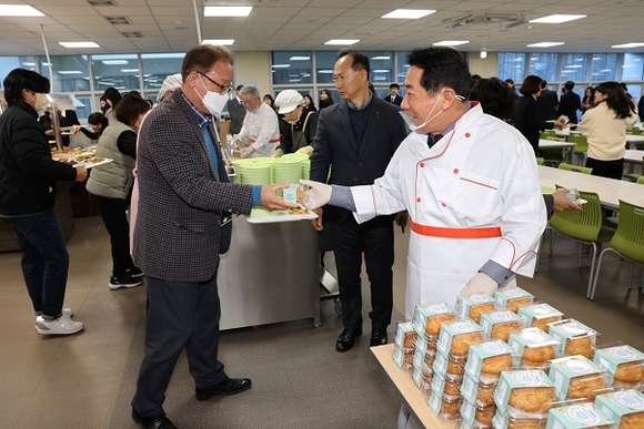 나동연 양산시장이 2일 갑진년 새해 시정의 첫 시작일을 맞아 시청 구내식당을 찾은 700여명의 공직자들에게 배식봉사를 하며 미소와 새해 인사를 나누는 소통의 시간을 갖고 있다. (사진=양산시 제공)