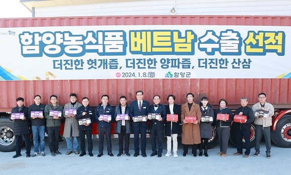 경남 함양군은 8일 안의면 ㈜함양산양삼에서 진병영 군수, 함양농식품수출진흥협회 회원사 대표 등 20여 명이 참석한 가운데, 40피트(ft) 2대 1억 3천만 원 규모에 산양삼가공품 3종을 베트남으로 수출하는 선적식을 가졌다.
